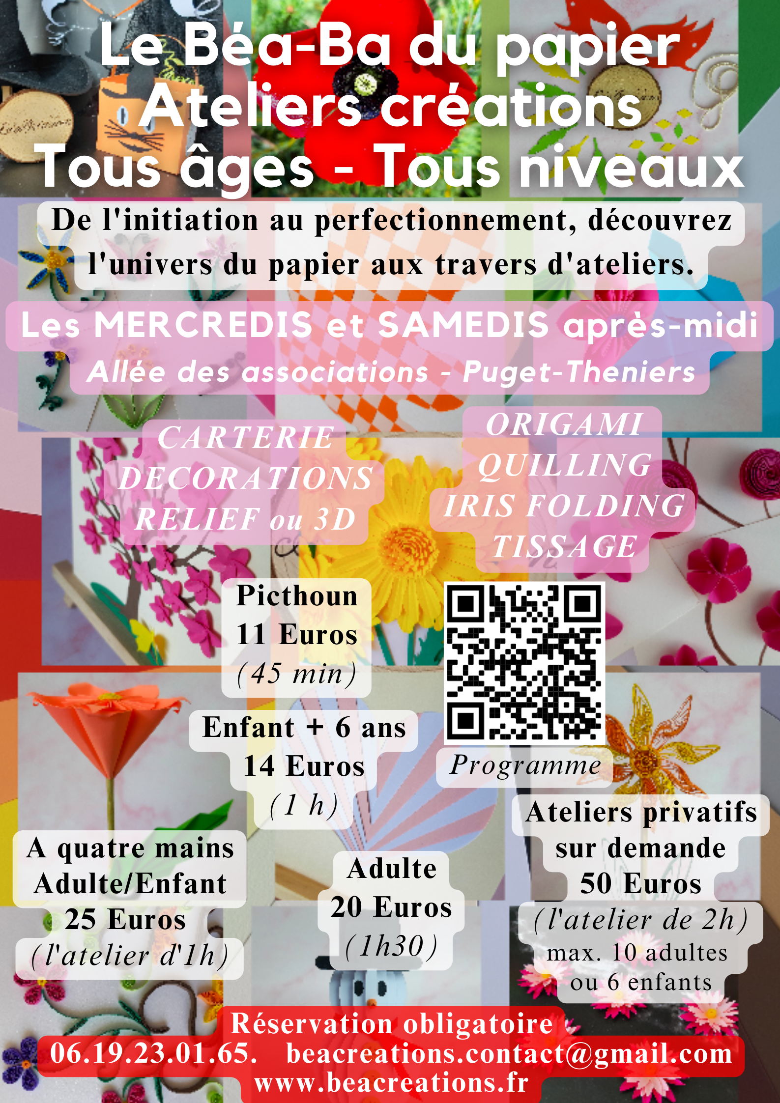 De 3 à 99 ans, ces ateliers créations sont l'occasion de vous amuser avec le papier, d'apprendre à le façonner et de vous initier à des techniques de manipulation du papier : origami, quilling, iris folding, pop-up… ses techniques n'auront plus de secret pour vous.